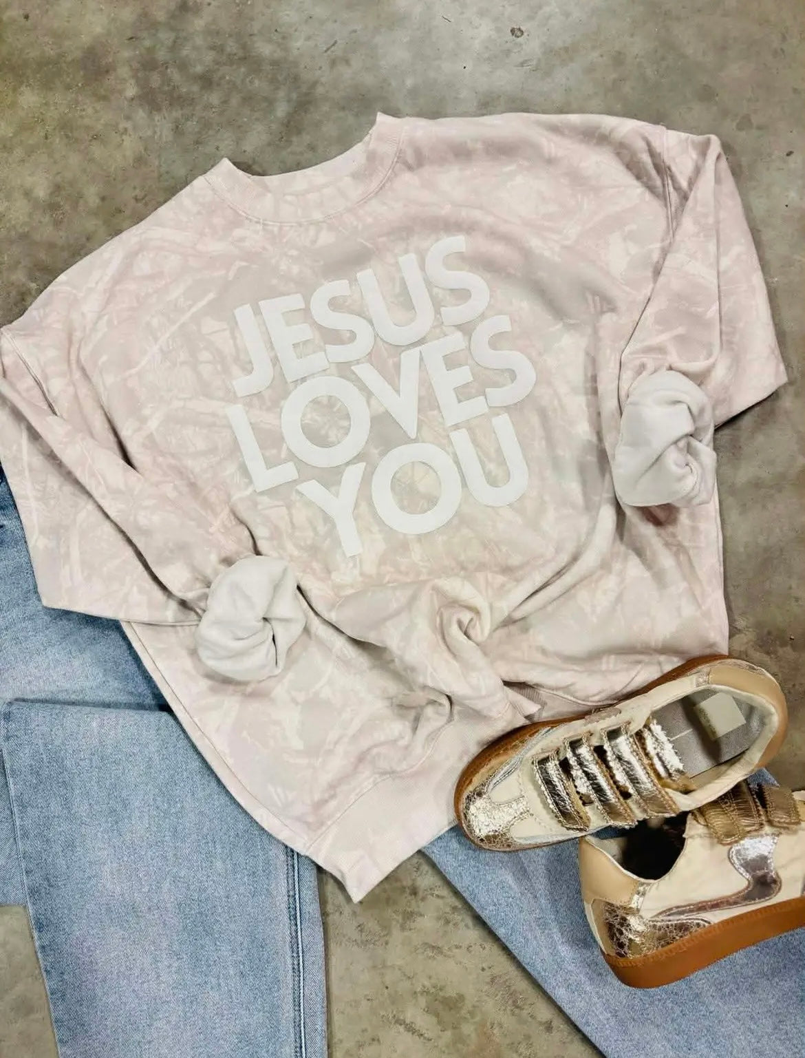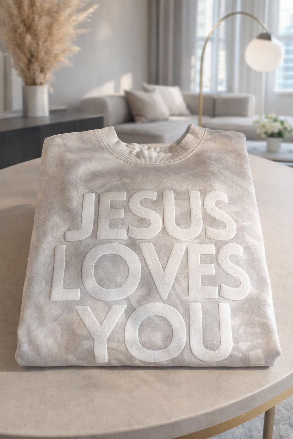 Faded beige camo crewneck with white puff lettering. What a perfect saying!