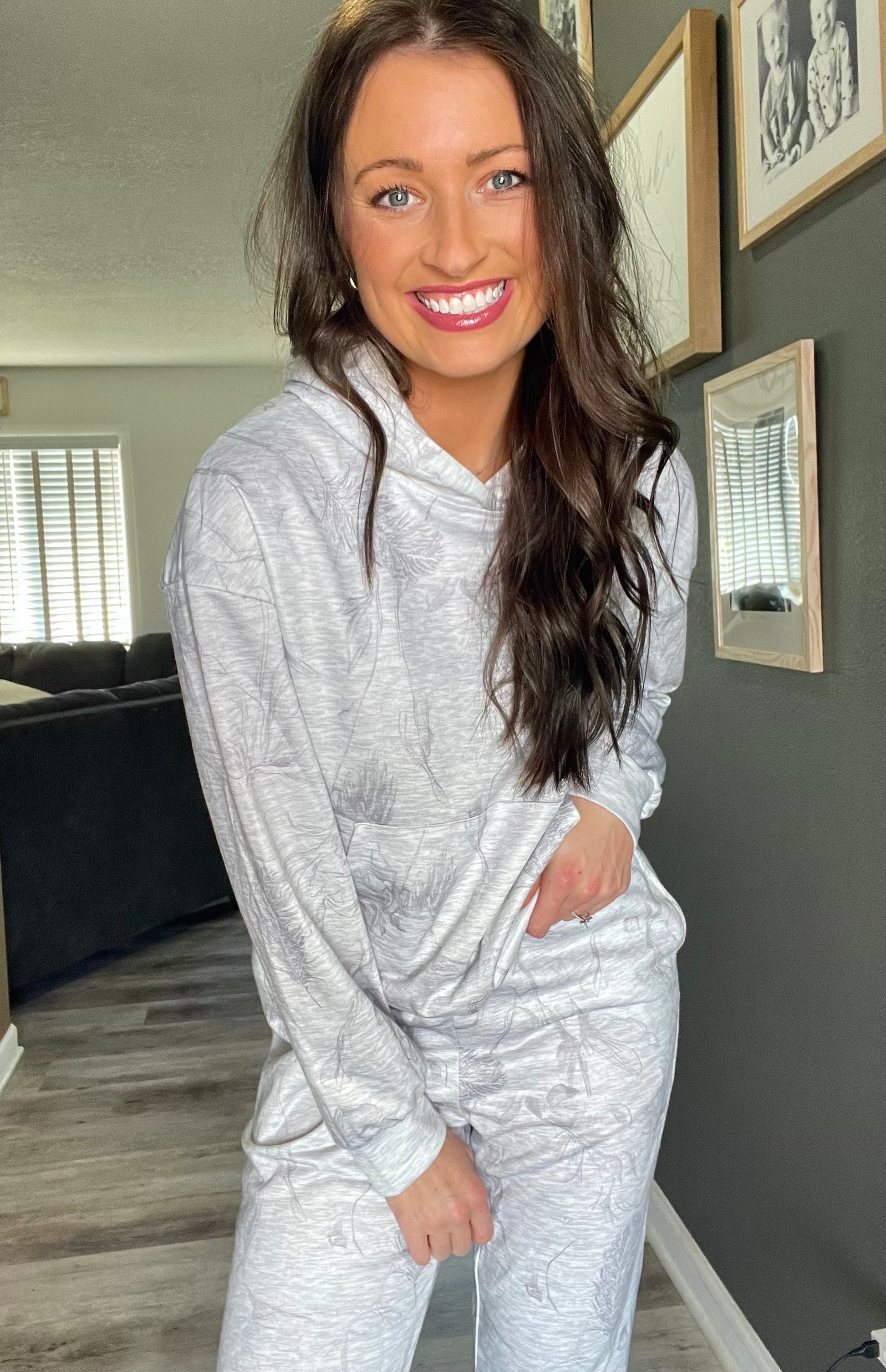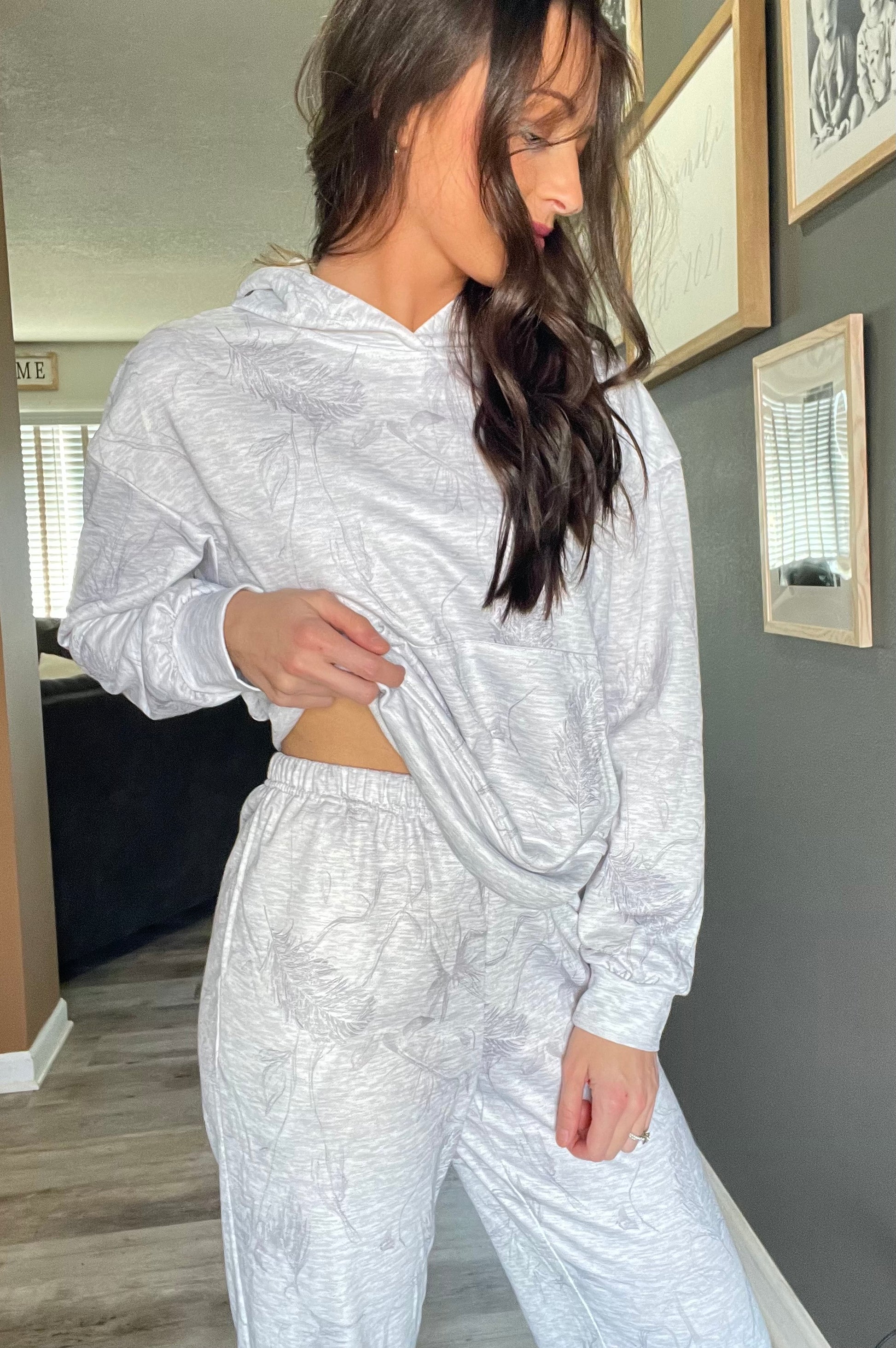 Enjoy comfy season in our leafy, two-piece elastic band, sweat set!
